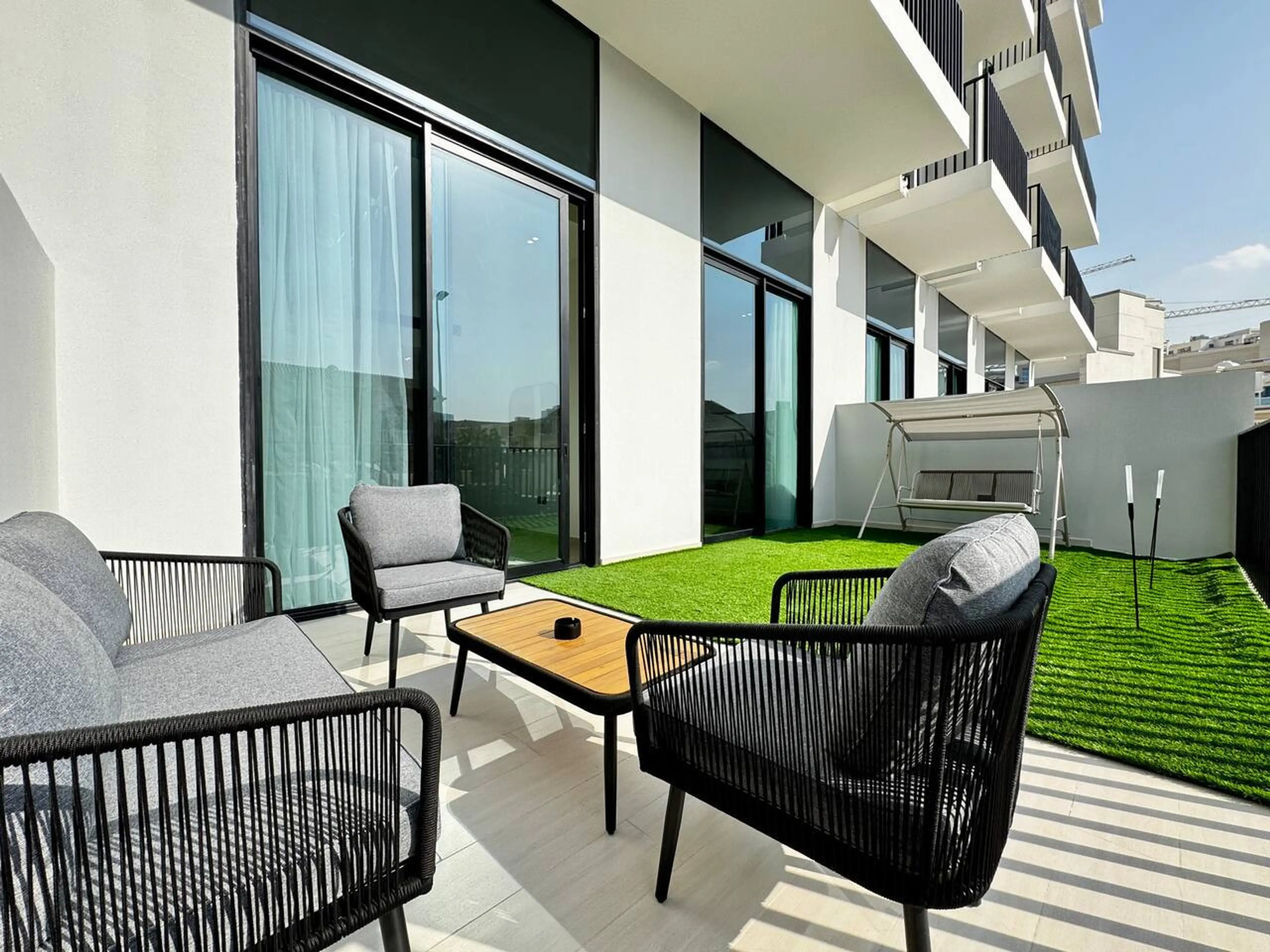 Experience modern luxury in this brand-new apartment at Binghatti Aurora, JVC. This stylish 1-bed, 1.5-bath retreat features a plush king bed and a massive outdoor terrace complete with a cozy swing chair and dining area. Enjoy world-class amenities including a resort style pool, state-of-the-art gy...